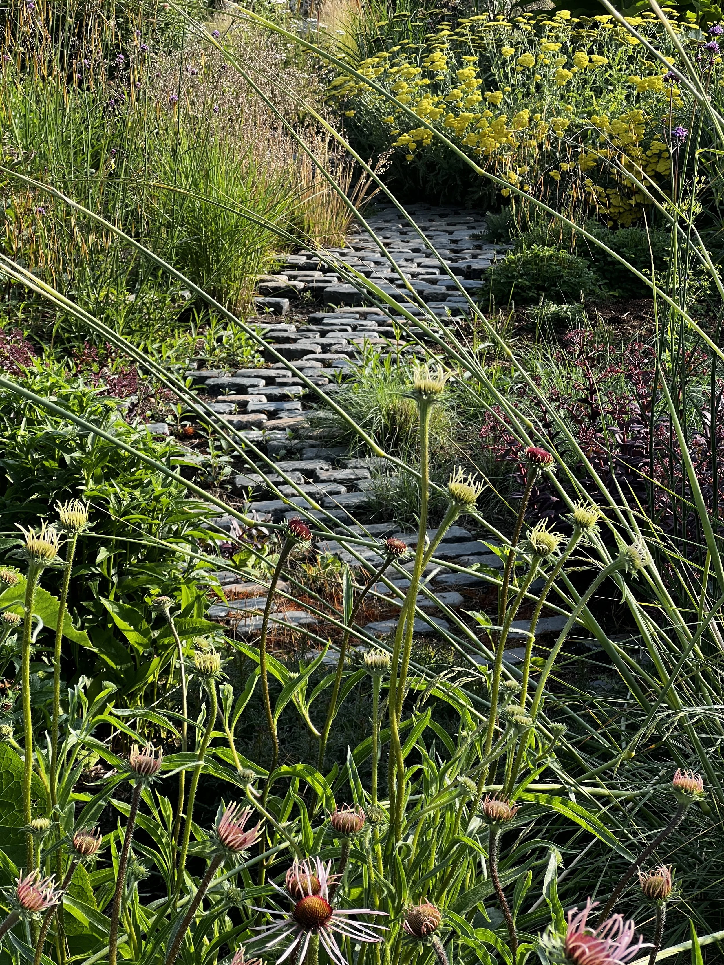 We Planted over 1000 perennials and ornamental grasses, weighting on a more naturalistic approach, relying on self-seeded species to help break up any formatlity. In addition, plants like Erigeron karvinskianus were planted between the cobbles to help create a controlled but overgrown style. In Spring, the planting can be cut down using a lawnmower on a high setting, leaving the cuttings for mulch.