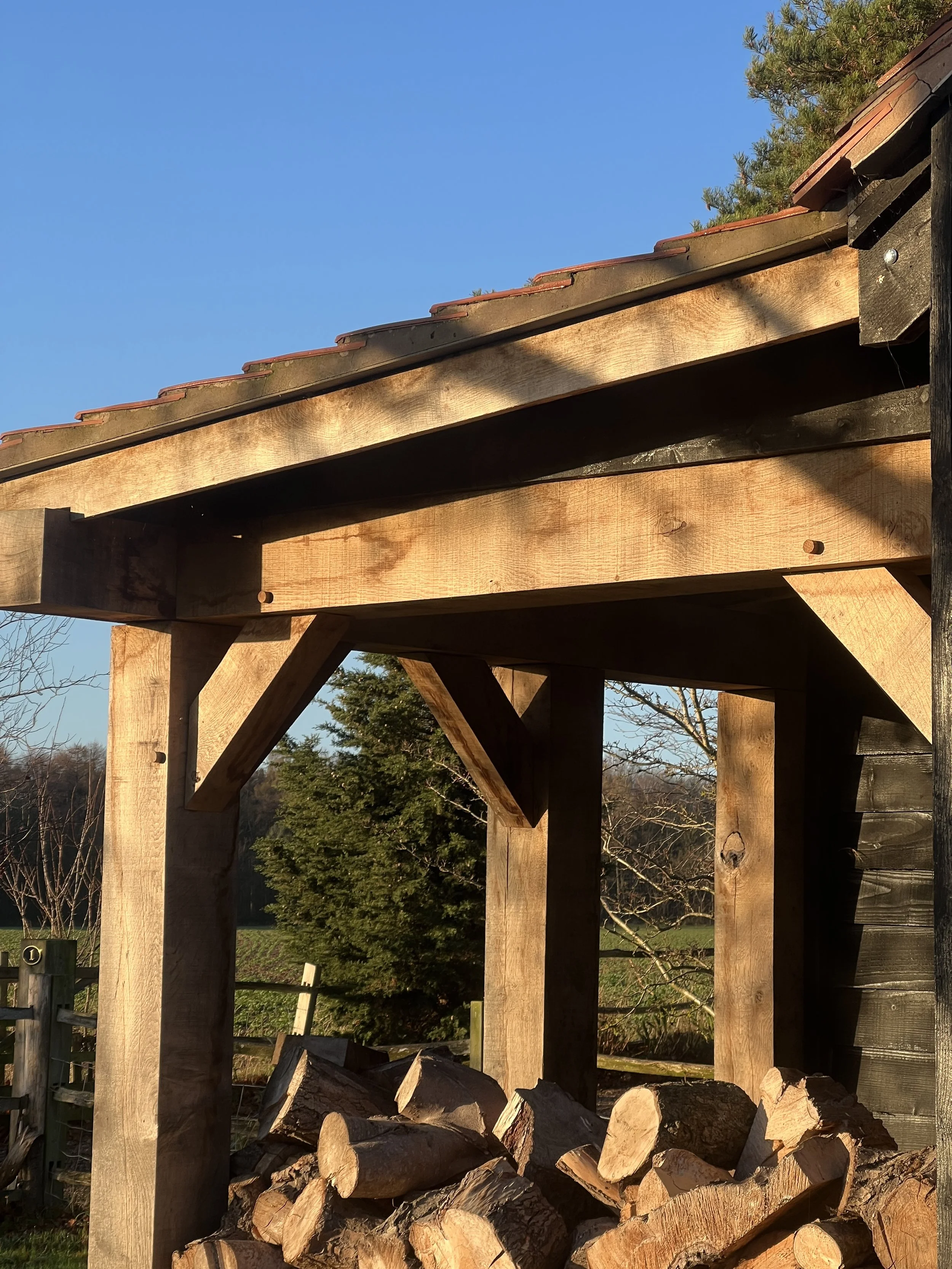 I've been noticing the oak frame on this garden log store this week; the way the joints sit tight, the grain running through the principal posts, the slight irregularities in the timber that give it character. We built this ourselves.
